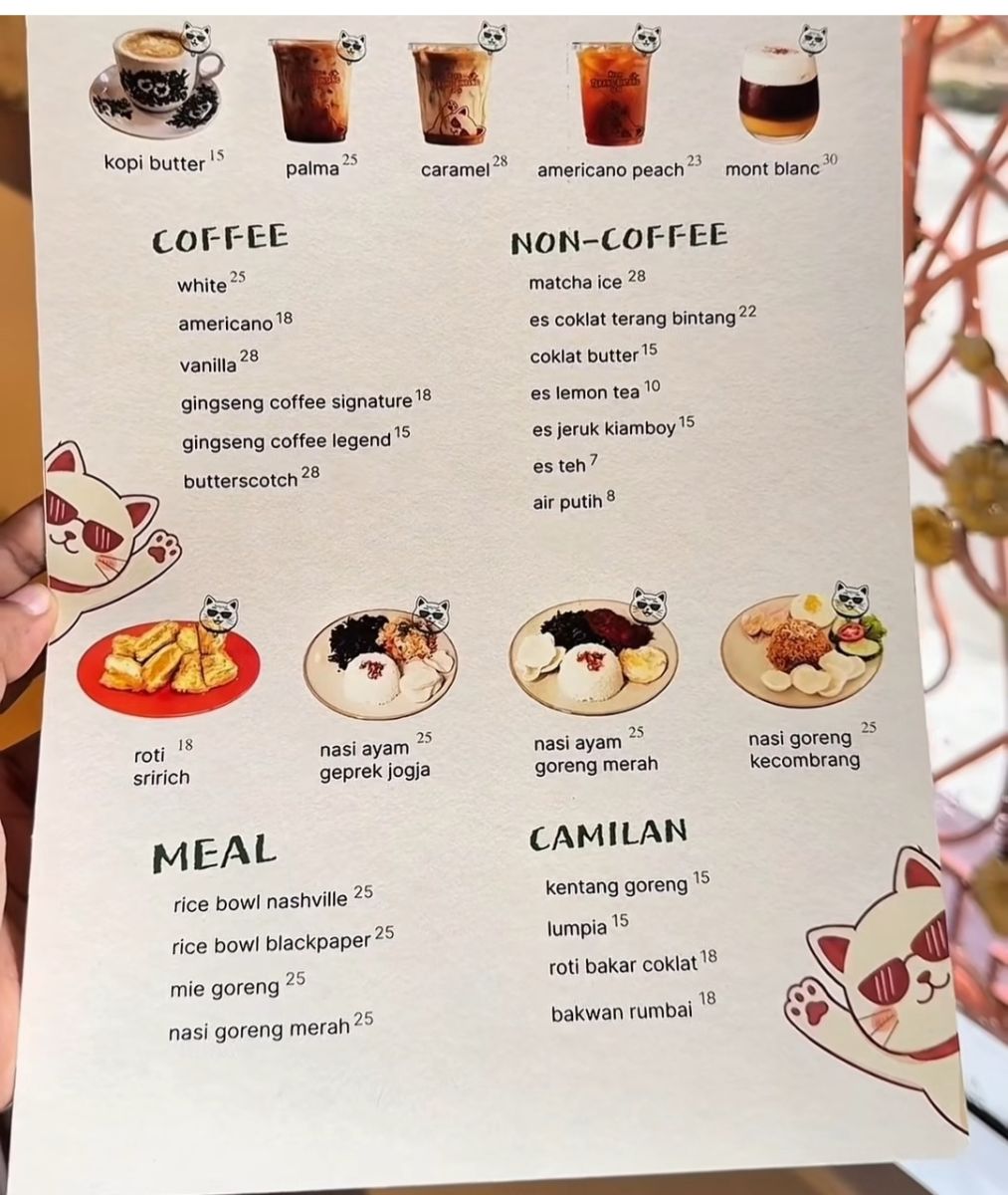 Begitu masuk, vibes-nya langsung kerasa: minimalis, estetik, dan nyaman. Banyak colokan, ada free WiFi, dan spot duduknya enak banget buat buka laptop. Plus, dekorasinya lucu-lucu, ada stiker kucing yang bikin tempat ini keliatan homey.
