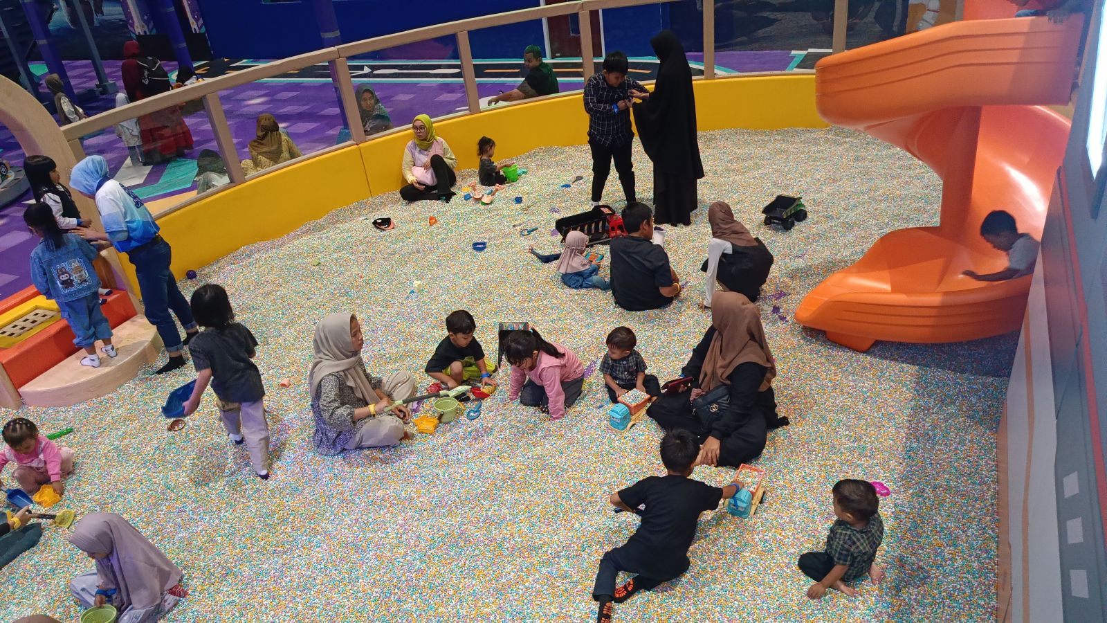 Mulai dari mandi bola, seluncuran warna-warni, trampoline, flying fox, hingga toddler zone khusus anak-anak, semuanya dirancang untuk bikin pengunjung betah berlama-lama.
