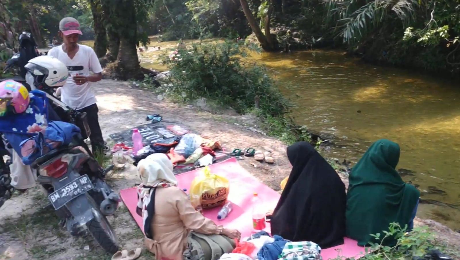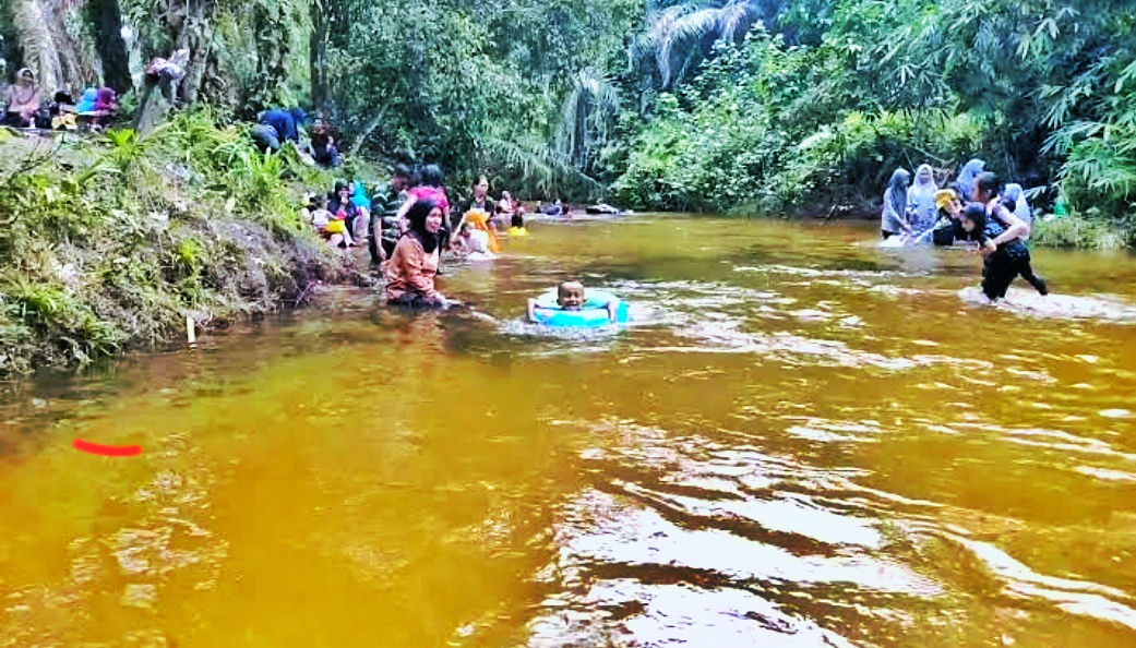 Di sekitar sungai, pepohonan dan kebun sawit memberikan suasana sejuk dan rindang. Banyak pengunjung memilih duduk santai di tepi sungai, menggelar tikar, atau sekadar menikmati suasana alam sambil bercengkerama bersama keluarga.