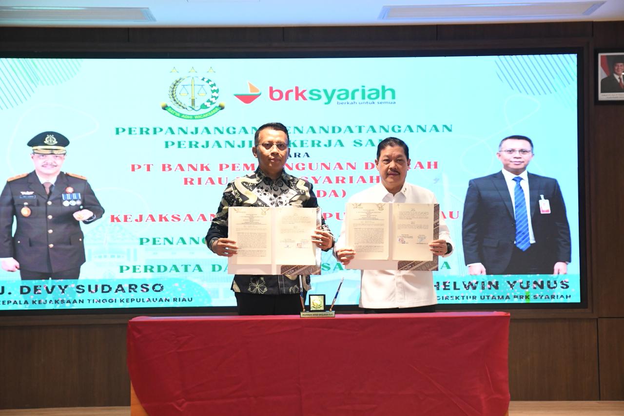 Penandatanganan perjanjian kerja sama tersebut dilakukan oleh Plt. Direktur Utama BRK Syariah, Helwin Yunus, bersama Kepala Kejaksaan Tinggi (Kajati) Kepulauan Riau, J. Devy Sudarso. Pada kesempatan yang sama juga dilakukan penyerahan cenderamata dari Kajati Kepri, J. Devy Sudarso kepada Plt. Direktur Utama BRK Syariah, Helwin Yunus didampingi Komisaris Independen BRK Syariah, Roy Prakoso dan Wakil Kajati Kepulauan Riau Diah Yuliastuti.
