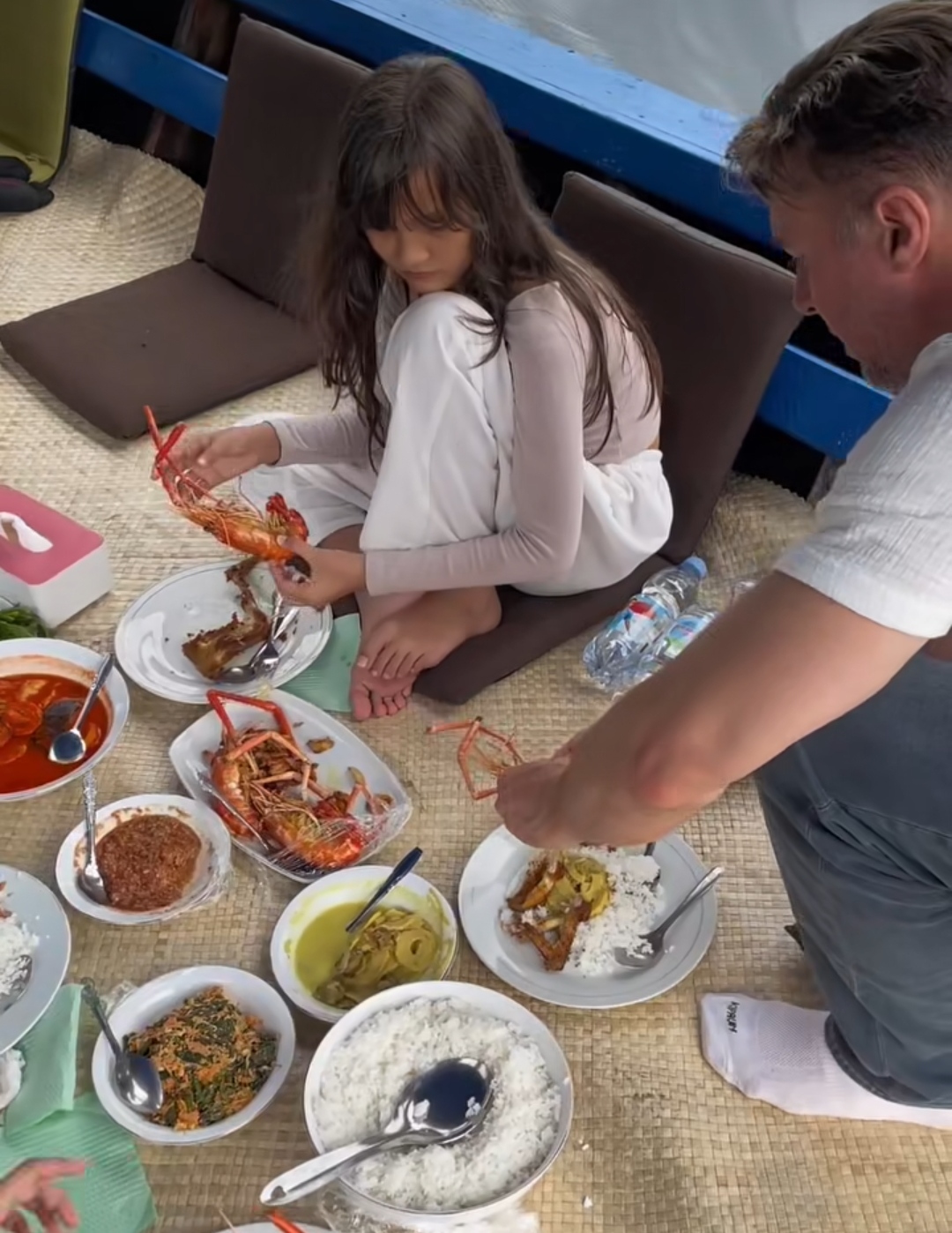 Nasi putih, sambal, sayur, hingga udang dan ikan tampak tersaji sederhana namun menggugah selera. Salah satu anak terlihat antusias memegang udang besar, sementara sang ayah sedang mengambil lauk untuk disantap bersama.