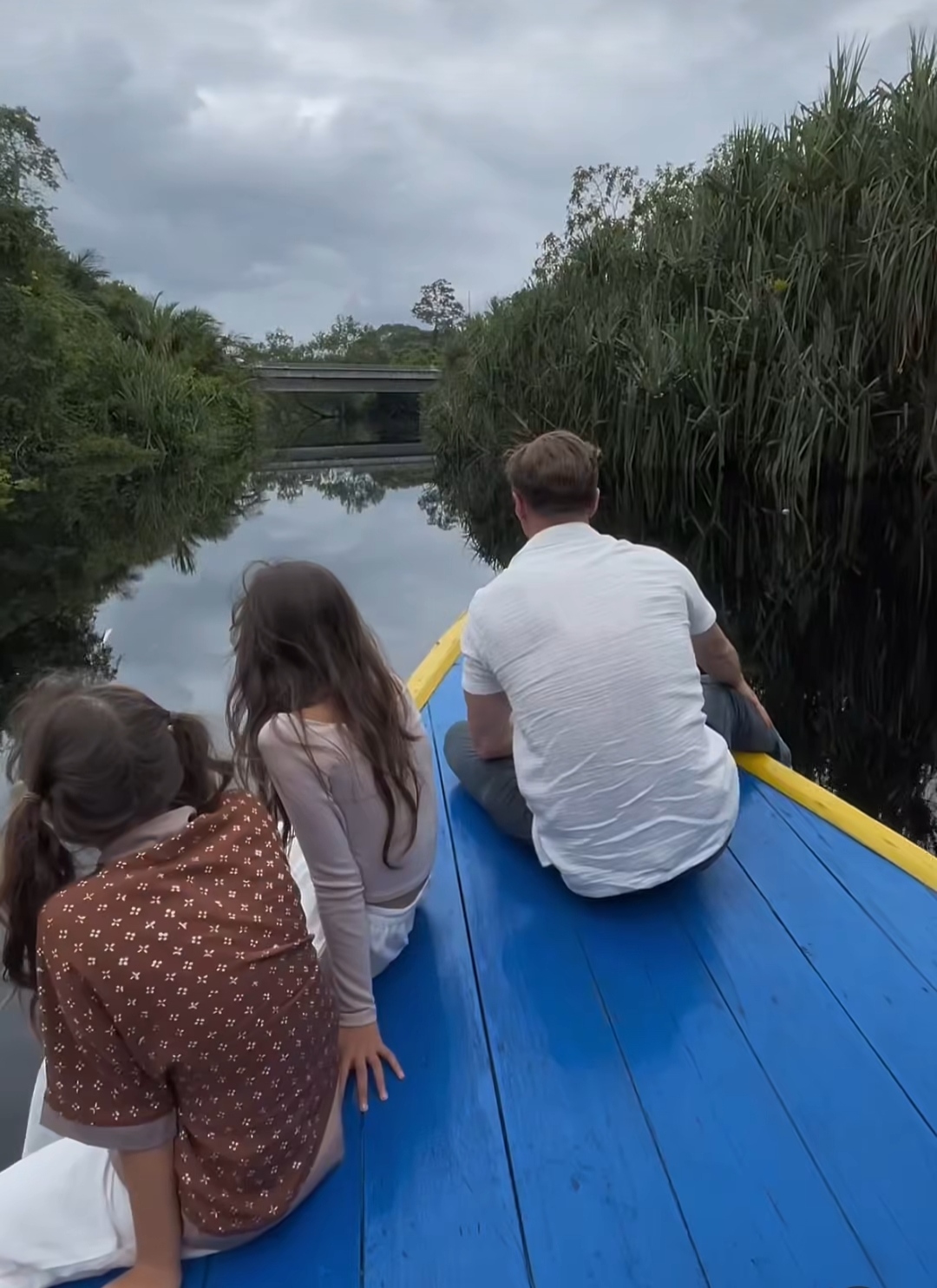 Di atas perahu, suasana terlihat hangat dan santai. Seorang pria turis asing tampak memegang kamera, seolah mengabadikan setiap momen perjalanan mereka. Di sampingnya, seorang wanita dan dua anak perempuan menikmati pemandangan sungai sambil sesekali tersenyum ke arah kamera.